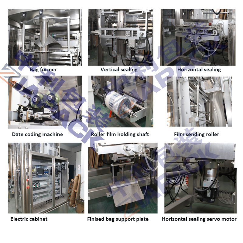 ਇਹ ਪੈਕਜਿੰਗ ਮਸ਼ੀਨ ਫਿਲਮ ਫੀਡ ਲਈ ਆਯਾਤ ਸਰਵੋ ਮੋਟਰ ਨੂੰ ਅਪਣਾਉਂਦੀ ਹੈ ਅਤੇ ਮੈਨ-ਮਸ਼ੀਨ ਇੰਟਰਫੇਸ ਐਡਵਾਂਸਡ ਟੱਚ ਸਕ੍ਰੀਨ ਦੀ ਵਰਤੋਂ ਕਰਦਾ ਹੈ। ਓਪਰੇਸ਼ਨ ਸਰਲ ਅਤੇ ਵਧੇਰੇ ਸੁਵਿਧਾਜਨਕ। ਸਾਰੇ ਹਿੱਸੇ ਅੰਤਰਰਾਸ਼ਟਰੀ ਪ੍ਰਸਿੱਧ ਬ੍ਰਾਂਡ ਨੂੰ ਅਪਣਾਉਂਦੇ ਹਨ, PLC ਸੀਮੇਂਸ ਹੈ, ਸਰਵੋ ਮੋਟਰ ਪੈਨਾਸੋਨਿਕ ਹੈ, ਟੱਚ ਸਕ੍ਰੀਨ ਸੀਮੇਂਸ ਹੈ, ਸਿਲੰਡਰ ਹੈ ਅਤੇ ਏਅਰ ਵਾਲਵ SMC ਹੈ। ਉਹ ਹਿੱਸੇ ਜੋ ਸਮੱਗਰੀ 、ਕੰਟਰੋਲ ਕੈਬਿਨੇਟ 、ਮੁੱਖ ਫਰੇਮ ਨਾਲ ਸੰਪਰਕ ਕਰਦੇ ਹਨ ਸਟੀਲ 304 ਦੇ ਬਣੇ ਹੁੰਦੇ ਹਨ