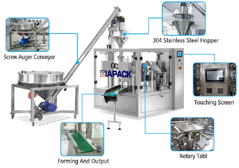 ਆਗੂਰ ਫਿਲਰ ਅਤੇ ਲਿਫਟ ਨਾਲ ਸਜਾਇਆ ਜਾਂਦਾ ਹੈ, ਇਹ ਪੈਕਿੰਗ ਪਾਊਡਰ ਤੇ ਵਿਆਪਕ ਤੌਰ ਤੇ ਲਾਗੂ ਹੁੰਦਾ ਹੈ, ਜਿਵੇਂ ਕਿ ਡਿਟਰਜੈਂਟ ਪਾਊਡਰ, ਦੁੱਧ ਪਾਊਡਰ, ਆਟਾ, ਮਸਾਲਾ, ਕੋਕੋ ਪਾਊਡਰ, ਜ਼ਮੀਨ ਦੀ ਕਾਫੀ ਆਦਿ.